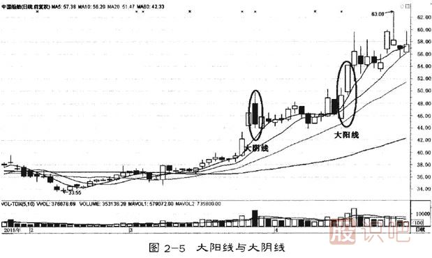 大陽線與大陰線的K線實體較中陽線與中陰線更長。較低價開盤后一路上升,并以全天較高價收盤,就可以有較短的上下影線存在,但在整體感覺上其較短的上下影線可忽略,陽線實體巨大,稱為大陽線(圖2一5)