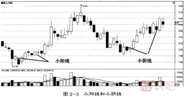 小陽線的波動范圍較小陽星增大些,多頭稍占上風,但上攻乏力,表明行情發(fā)展撲朔迷離(如圖2-3)