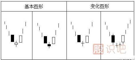 股價在跌至新低(或前期成交密集區(qū))時,往往會收一根中陰線或大陰線,看似大勢不妙,但第二天股價只是小幅跳空下行。收盤時收出一實體部分較短,帶有上下影線的小陽線或小陰線或十字星,形成星體部分。而第三天股價就在平開或微微開高后,一路上行,最終收一中陽線(或大陽線),企穩(wěn)待漲信號正式發(fā)出。