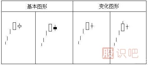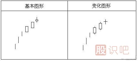 1、基本圖形:強弩之末是發(fā)生在上升趨勢末端的三根K線組合形態(tài),圖形如下: