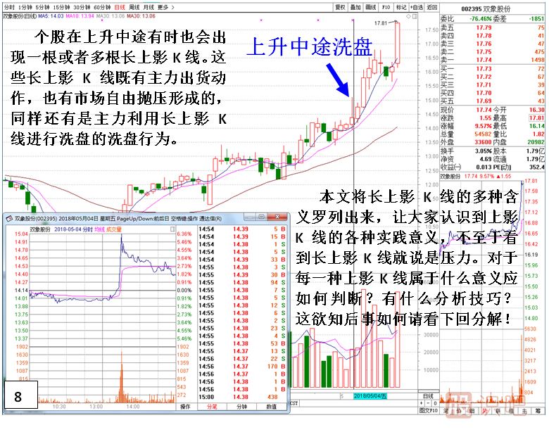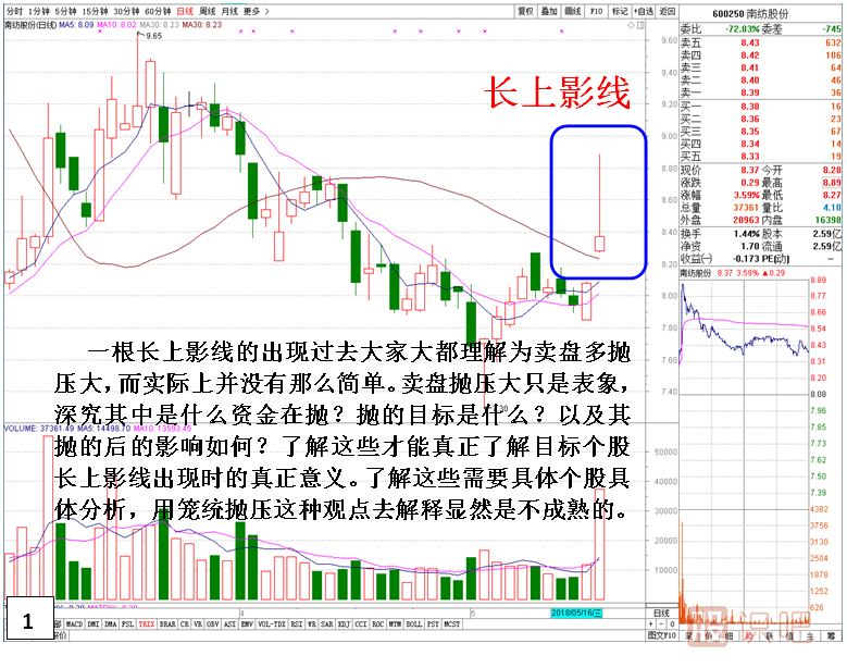 傳統(tǒng)技術(shù)分析中個股或指數(shù)K線出現(xiàn)長上影線,市場對其讀解是賣方賣盤拋壓大導(dǎo)致股價沖高回落。讀解的最終結(jié)果就是上升拋壓大。而在實踐中筆者發(fā)現(xiàn)長上影線所代表的真正意義并沒有那么簡單。根據(jù)個股的形態(tài),位置,出現(xiàn)時段,交易主體的不同其意義有重大區(qū)別。下面就將本人多年實踐總結(jié)出來的經(jīng)驗?zāi)贸鰜砼c各位分享學(xué)習(xí)。