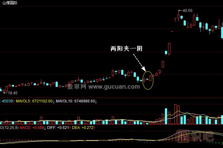 如圖4所示,山煤國際(600546)圍繞30日均線筑底完成后,股價在22.00元一帶形成兩陽夾一陰K線組合。通過對三根K線的力量進行對比可以清晰地發(fā)現(xiàn),市場的主流資金仍然以做多為主,絲毫沒有拋售股票的跡象。既然如此,投資者完全可以跟隨主流資金一直做多。從圖中可以看到該股后期的走勢非常強勁,投資者若及時跟進,獲利必然會非常豐厚。兩陽夾一陰屬于短線性的K線組合形態(tài),其中處于箱頂和上升中途的,要求以短線進出為好,并不適合中長線投資者的參與,只有那種處于底部的才適合中長線投資者逢低買人。