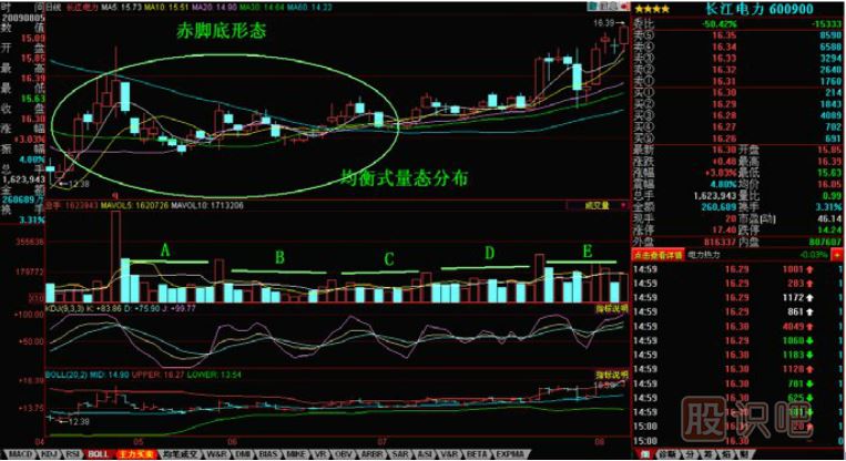 1、符合均衡式建倉量態(tài)分布,K線呈赤腳底形態(tài);