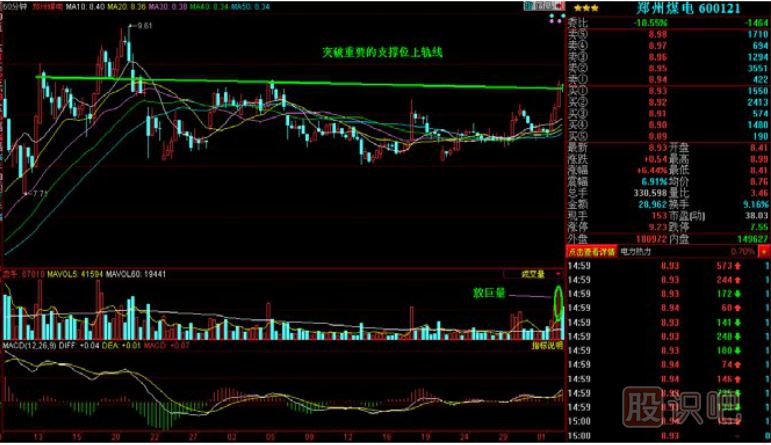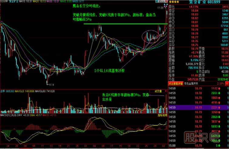 6、當日盤中出現(xiàn)突破時,60分鐘突破型K線的換手率至少要達到1%以上,而3%則是標準性信號。突破型K線以大陽K線為佳。如僅小陽突破,有放量滯漲嫌疑,有效性較差。
