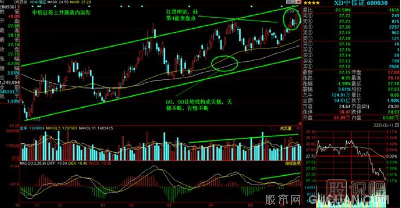 趨勢(shì)投資是投資理論的最最重要核心,是技術(shù)分析要駕馭和把握的對(duì)象。上升或下降通道就是最常見的趨勢(shì)之一。目前我們觀察到很多個(gè)股處在開往春天列車的上升通道內(nèi),用通道理論挖掘潛力股是捕捉前期滯脹的尤其一些藍(lán)籌較好的實(shí)戰(zhàn)方法。結(jié)合中信證券(如圖)進(jìn)行分析: