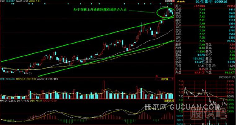 3、突破回踩有效。突破后,股票價(jià)格會(huì)自然回落,重新回到原來的上升通道的上軌附近,這個(gè)過去的阻力線現(xiàn)在變成了一個(gè)支撐。當(dāng)不破原通道上軌,並且準(zhǔn)備反身向上的時(shí)候,是一個(gè)突破買點(diǎn)更安全的買點(diǎn)。這就是回踩確認(rèn)有效的介入點(diǎn)。