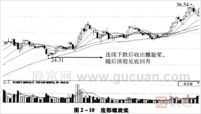 當(dāng)股價(jià)經(jīng)過一段時(shí)間的下跌之后,出現(xiàn)螺旋槳K線,意味著股價(jià)很可能即將見底,這是一個(gè)看漲的信號(hào),投資者遇到這樣的K線可以適當(dāng)買入,待漲勢(shì)形成,就可以繼續(xù)追加投入。如圖2-10所示