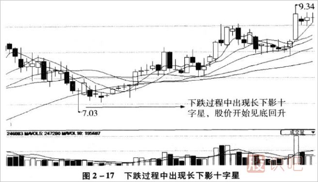 如果次日股價再次下跌并創(chuàng)新低,則預(yù)示著后市或許還有較大的跌幅,這樣的十字星被稱為“下跌工兵”,長下影的十字星為空方試探下方區(qū)域的支撐,再次下跌是對下降趨勢的確認,這樣的股票不能盲目買入,如同2-18所示。