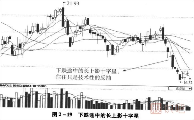 長上影十字星如果出現(xiàn)在下降趨勢中途,一般表示暫時休整,下降趨勢未改,這樣的K線一般是主力盤中向上拉升,以讓散戶誤以為多頭猛攻,結(jié)果抄底被套,而這些被套的投資者短線賣出就會形成新的“多殺多”,進而使得股價繼續(xù)下跌,如同2-19所示