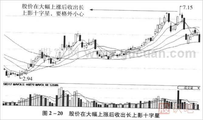 如果長上影的十字星出現(xiàn)在已經(jīng)持續(xù)大幅上漲之后的高價區(qū),股價轉(zhuǎn)向下跌的可能性較大,沖高回落的K線表明多方上攻乏力,遇到這樣的K線應(yīng)該先行賣出,如圖2-20所示。