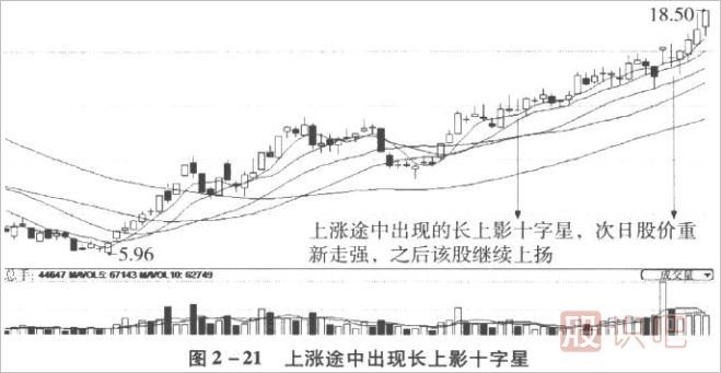 從圖2-11我們可以發(fā)現(xiàn),十字星還有上影較長和下影較長的十字星,這樣的十字星又預(yù)示著股價未來將會有怎樣的走勢呢?我們繼續(xù)看一看。
