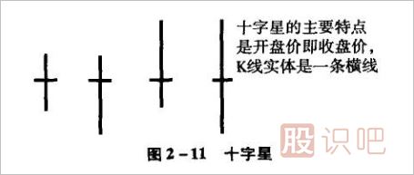 十字星K線與螺旋槳有一個共同點,就是K線上下方都有長影線,其區(qū)別在于:螺旋槳的上下影很長,K線實體很??;十字星的實體則只是一條橫線,上下影可長可短,K線實體與上下影構(gòu)成了一個“十字架”的圖形,因而得名“十字星”。如圖2-11所示