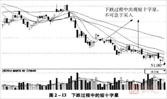 如果十字星上下影較短,則表明雙方都比較謹慎。如果股價處于上升趨勢,那么這樣的K線只能當成是上升過程中的主力洗盤,股價還會繼續(xù)上揚,投資者應(yīng)以持有為主,如圖2-12;如果股價處于下降趨勢中,這樣的K線則只能當成是“下跌中繼”,股價回抽之后還會繼續(xù)下跌,投資者宜加以觀望。如圖2-13所示。