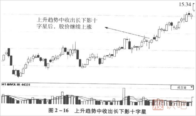 長下影十字星如果出現(xiàn)在上升趨勢形成初期,一般表示暫時休整,上升趨勢未改,空方雖然進行了一次反攻,但最后股價仍然收了回去如圖2-16所示;如果是出現(xiàn)在持續(xù)下跌之后的低價區(qū),則暗示賣盤減弱,買盤增強,股價轉(zhuǎn)向上升的可能性在增大,如圖2-17所示