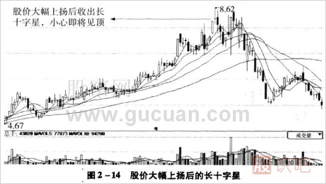 長十字星如果出現(xiàn)在股價上升一段時間之后,那么該股股價很可能即將見頂,由升轉(zhuǎn)跌。如圖2-14所示,這只股票在經(jīng)過大幅上揚之后,日k線收出一根長十字星,股價短暫停頓后繼續(xù)又上漲了一段,這時多方已經(jīng)有些力不從心,而之前的十字星表明空方已進行了一次強力打擊,此時投資者應(yīng)該減倉,隨后該股見頂,股價由漲轉(zhuǎn)跌,如果能夠在出現(xiàn)長十字星時采取謹慎的操作手段,就能回避后面的下跌。