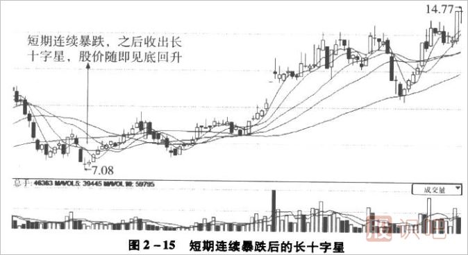 相反,長十字星如果出現(xiàn)在股價下跌一段時間之后,那么股價也很可能即將見底,由跌轉(zhuǎn)升。我們來看圖2-15所示的股票,這只股票出現(xiàn)了罕見的短期連續(xù)大跌,調(diào)整較為充分,當K線收出長十字星時,顯示空方殺跌力量已有不足,多頭開始嘗試反攻。此時,激進的投資者就可以“買跌”,隨后該股便探明了底部,開始一路上揚??梢?,長十字星出現(xiàn)在連續(xù)下跌后是明顯的見底信號。