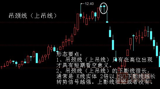 吊頸線(上吊線)形態(tài)在高位出現(xiàn)是強(qiáng)烈的看空形態(tài),必須及時作出賣出決定。