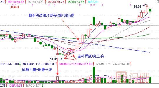 機(jī)器人(300024)2010年2月,這是一個(gè)經(jīng)典的底部,先是倒錘子線和底部大量組合,隨后出現(xiàn)了金針探底完成了底部確認(rèn),最后是一個(gè)紅三兵多方炮,最終股價(jià)完成了漂亮的V形反轉(zhuǎn)。底部出現(xiàn)紅三兵后股價(jià)在11個(gè)交易日漲幅67%,紅三兵威力可見一斑。此處需要我們注意的是,該股這個(gè)底部是個(gè)多個(gè)底部形態(tài)的復(fù)合體,這也為實(shí)戰(zhàn)參與提高了成功概率,而且這個(gè)股票均線和趨勢(shì)最佳買點(diǎn)同時(shí)出現(xiàn),實(shí)盤中確實(shí)給了大家很多機(jī)會(huì)。
