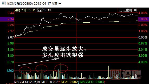 博瑞傳播(600880),該股在2013年4月16日、17日和18日出現(xiàn)紅三兵底部反轉(zhuǎn)形態(tài),同時(shí)股價(jià)越過短期下降趨勢(shì)線,成交量相對(duì)放大,實(shí)盤時(shí)可考慮試探性參與。大家需注意,這個(gè)地方陽(yáng)線、實(shí)體幅度時(shí)遞增的,顯示多方攻擊力度遞增,所以此類形態(tài)是最強(qiáng)的紅三兵;另外就是分時(shí)走勢(shì),下圖。該股4月17日分時(shí)走勢(shì)圖就能明顯看到分時(shí)多方呈現(xiàn)出放量攻擊態(tài)勢(shì),向上成交量堆逐步放大。