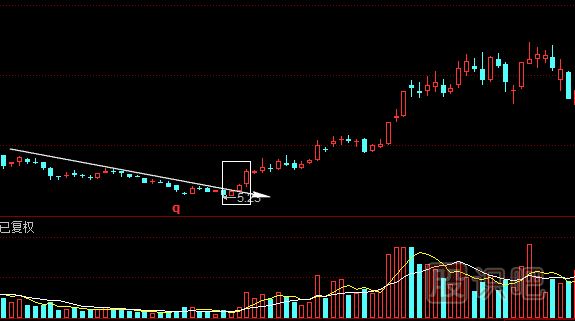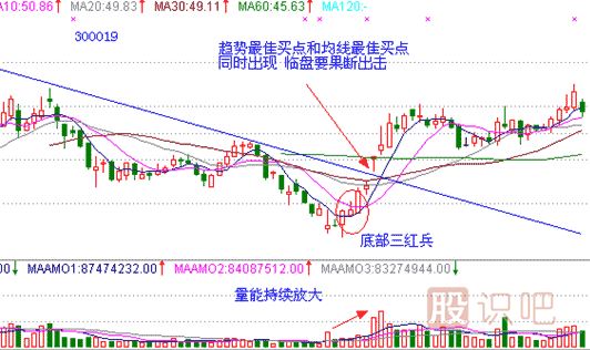 硅寶科技(300019)2010年2月,底部出現(xiàn)紅三兵后,量能持續(xù)放大,股價(jià)越過下降趨勢(shì)線壓制和均線密集封鎖,趨勢(shì)和均線最佳買點(diǎn)同時(shí)出現(xiàn),臨盤狙擊沒商量。從上圖看股價(jià)走勢(shì)非常凌厲,和上述案例一樣,股價(jià)最終完成了漂亮的底部V形反轉(zhuǎn)。