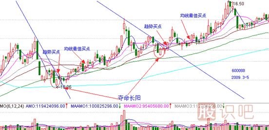600088,中視傳媒,2009年3月10日和5月12日在波段底部都出現(xiàn)了奪命長陽,兩處同樣出現(xiàn)了趨勢買點和均線最佳買點,操盤手的慣性操盤習(xí)慣告訴了我們準(zhǔn)確抄底的絕佳時機(jī)。