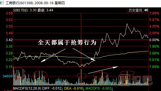 工商銀行(601398)2008年9月18日,拉出了大陽線,振幅達(dá)14%。匯金公司當(dāng)晚突然宣布增持,隨后股價連拉兩個漲停,短線漲幅30%以上。9月18日這個詭秘的大陽線回過頭來看,雖是先知先覺和獲知內(nèi)幕的主力涌進(jìn)的短線抄底盤,成交量大幅放大,出現(xiàn)奪命長陽時短線80%以上的概率會繼續(xù)大漲,但需要注意圖中30日生命線、60日決策線、120日趨勢線仍然大角度向下發(fā)散呈現(xiàn)空頭排列,這個底部只是短線底部,反彈早已注定了只是曇花一現(xiàn),大級別的歷史底部還沒到來。另外,還需要注意的就是當(dāng)日該股的分時圖,主力全天候都在搶籌,這也為后續(xù)幾日大漲,埋下了伏筆。