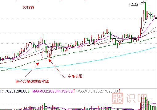 奪命長陽,又稱絕地長陽,有的日本分析師稱之為看漲反擊線,其實怎么稱呼它并不重要,重要的是我們需要分析一下此形態(tài)市場內(nèi)涵。奪命長陽,準(zhǔn)確的說是有兩根K線組成的,一根陰線后面跟著一根長陽線,在形態(tài)要求上這樣就夠了,圖一多根K線是為了讓大家看的更明白一些,在實際判斷中,只要出現(xiàn)大陽線后短線即可跟進(jìn)。這個地方與刺透形態(tài)不同,刺透形態(tài)要求陽線實體侵入陰線實體1/2以上,這里的奪命長陽則是在要求侵入陰線實體1/2以下,而且這個長陽線振幅一般要求要在5%以上,要有足夠的視覺沖擊效果才可稱之為奪命長陽。所謂奪命長陽很好理解,就是要了空頭的命。