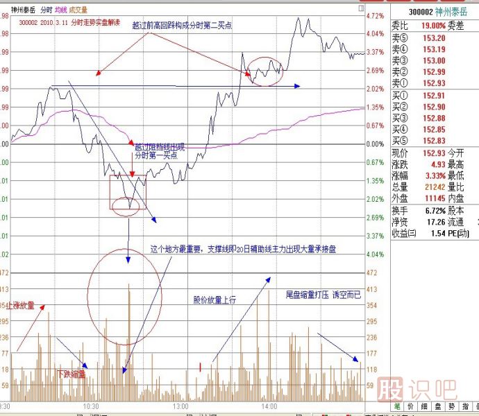 技術(shù)分析不是那么簡(jiǎn)單,不是讀讀波浪理論、搞搞江恩理論,然后再弄幾個(gè)技術(shù)指標(biāo)就算技術(shù)高手了,能在第一時(shí)間對(duì)股價(jià)走勢(shì)進(jìn)行精準(zhǔn)打擊,就必須對(duì)分時(shí)的量能結(jié)構(gòu)和具體的微細(xì)的盤(pán)口細(xì)節(jié)具備相當(dāng)?shù)恼J(rèn)知和解讀能力,下面是我今日(2010.3.11)實(shí)盤(pán)講解時(shí)對(duì)300002分時(shí)盤(pán)口的解讀,這是如何在第一時(shí)間對(duì)買(mǎi)點(diǎn)進(jìn)行精準(zhǔn)撲捉的實(shí)盤(pán)運(yùn)用,希望大家都好好看看,很多東西會(huì)在以后操盤(pán)中會(huì)周而復(fù)始的出現(xiàn),我們來(lái)看下面這幅圖: