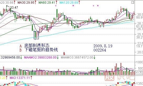 刺透形態(tài),又稱(chēng)斬回線(xiàn)形態(tài)、旭日烘底、刨根問(wèn)底,叫法挺多,本來(lái)想用刨根問(wèn)底來(lái)命名,后來(lái)想想炒股是一門(mén)嚴(yán)謹(jǐn)?shù)目茖W(xué),和趙本山的小品不能混為一談,我們還是用個(gè)嚴(yán)肅的名字。