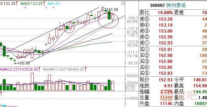 對(duì)刺透形態(tài)的運(yùn)用不僅限于長(zhǎng)期底部,而且適用于股價(jià)的調(diào)整階段,在底部形態(tài)(一)啟明星篇中說(shuō)過(guò)300002神州太岳,那時(shí)股價(jià)近160元,建議大家調(diào)整到140元左右進(jìn)行低吸,今天機(jī)會(huì)就來(lái)了。