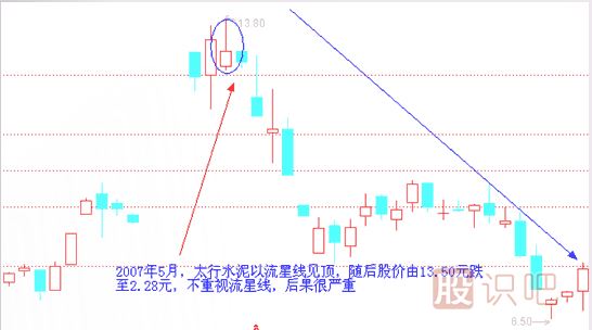 實(shí)戰(zhàn)范例四:5月,太行水泥以流星線形態(tài)見頂,隨后股價(jià)開始了熊途之旅,從13.50元跌至2.28元,可謂不識(shí)流星線,后果很嚴(yán)重!