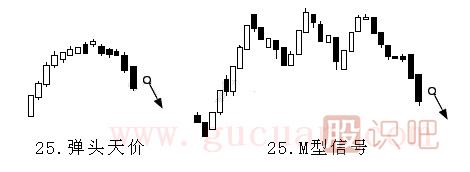 所謂M字型(或稱倒W型)系指行情出現(xiàn)第一次天價(jià)后,開(kāi)始回跌,當(dāng)?shù)诙蜗蛱靸r(jià)挑戰(zhàn)時(shí),卻因大量賣盤涌現(xiàn),無(wú)法突破第一次天價(jià)價(jià)位,在第一次天價(jià)價(jià)位附近形成第二次天價(jià),然后下跌。這種形態(tài)類似英文字母“M”,故稱“M字型”。這是明顯的賣出信號(hào)