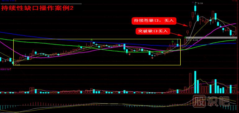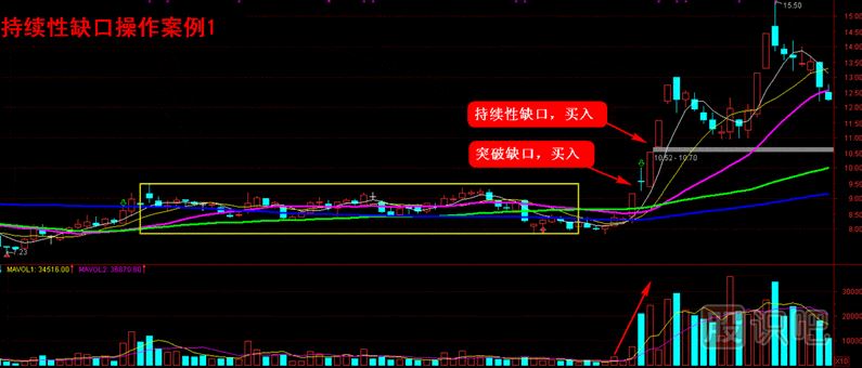 就持續(xù)性缺口的操作而言,投資者可以在出現(xiàn)持續(xù)性缺口后做出買入或者賣出決策,當(dāng)方向向上時買入,此時同樣需要成交量的放大來對價格進行驗證(漲停板模式除外);反之,方向向下時賣出。
