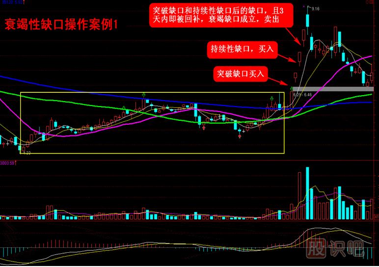 衰竭性缺口又稱消耗性缺口,一般發(fā)生在突破缺口行情趨勢的末端,表明股價劇烈變動的結(jié)束。在出現(xiàn)突破缺口和持續(xù)性缺口之后所出現(xiàn)的缺口往往是衰竭性缺口。它與持續(xù)性缺口的不同之處在于:衰竭性缺口的成交量會急劇放大,且往往會在短期內(nèi)被回補,當(dāng)缺口回補時,衰竭性缺口即宣告成立,則該輪缺口急速上漲行情也宣告結(jié)束。