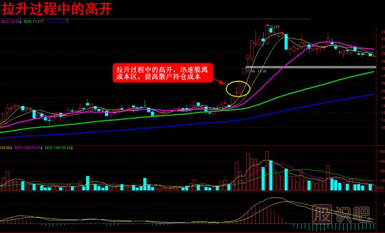 在啟動(dòng)或拉升過(guò)程中,莊家為了達(dá)到快速拉升的目的,往往采用高開(kāi)高走的方式迅速脫離成本區(qū),吸引眼球,吸引跟風(fēng)盤(pán),并提高散戶的持倉(cāng)成本。
