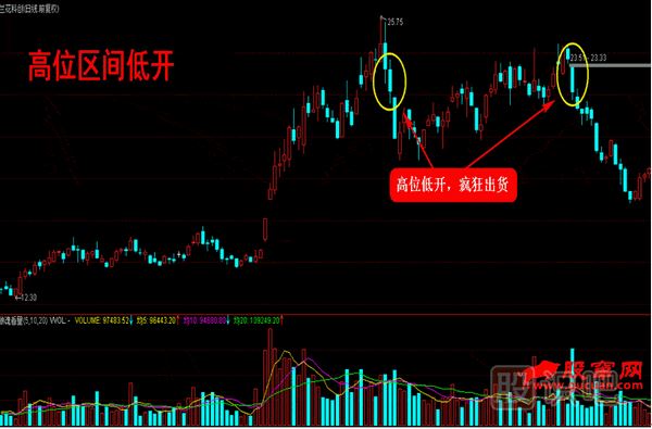 高位區(qū)間低開(kāi)是高位區(qū)間常見(jiàn)的K線形態(tài)之一,往往意味著莊家進(jìn)行最后瘋狂的出貨。