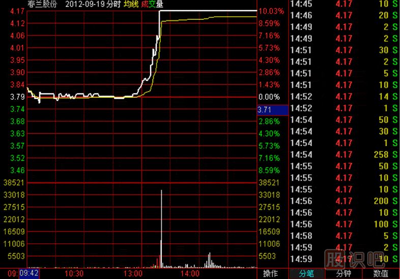 (圖示:600854 春蘭股份 2012年9月19日分時(shí)圖)