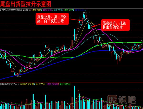 出貨型拉升是指莊家為了完成出貨目的,在尾盤(pán)進(jìn)行瘋狂拉升的手法。出貨型拉升有兩種:第一種是尾盤(pán)突襲拉升,第二天早盤(pán)繼續(xù)沖高拉升出貨空間,然后向下瘋狂出貨;第二種是利用尾盤(pán)拉升,做出漂亮的K線形態(tài),掩蓋其出貨的本質(zhì),以欺騙散戶。