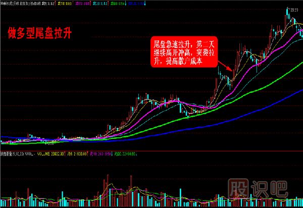 做多型拉升往往是指莊家在建倉(cāng)完畢后,計(jì)劃快速拉升,以迅速脫離成本區(qū),讓更多的散戶在更高的價(jià)格才能夠吃到貨,采用尾盤(pán)急速拉升的手法,多見(jiàn)于上漲階段。