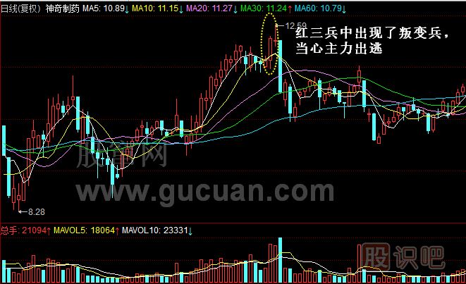 4.紅三兵會(huì)出現(xiàn)“紅三將、小逃兵、叛變兵”三種變異,分別代表著不同的技術(shù)含義,投資者要認(rèn)真區(qū)分。