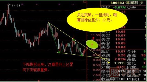 楔形是一種持續(xù)形態(tài),適用于中線分析,通常拖延至三至六個(gè)月時(shí)間,短線分析意義不大,而且容易被騙。上周在盤中給大家提示的下降楔形最后被騙就是這個(gè)道理。向大家道歉了,接下來(lái)我會(huì)更加謹(jǐn)慎和努力為大家服務(wù)好。