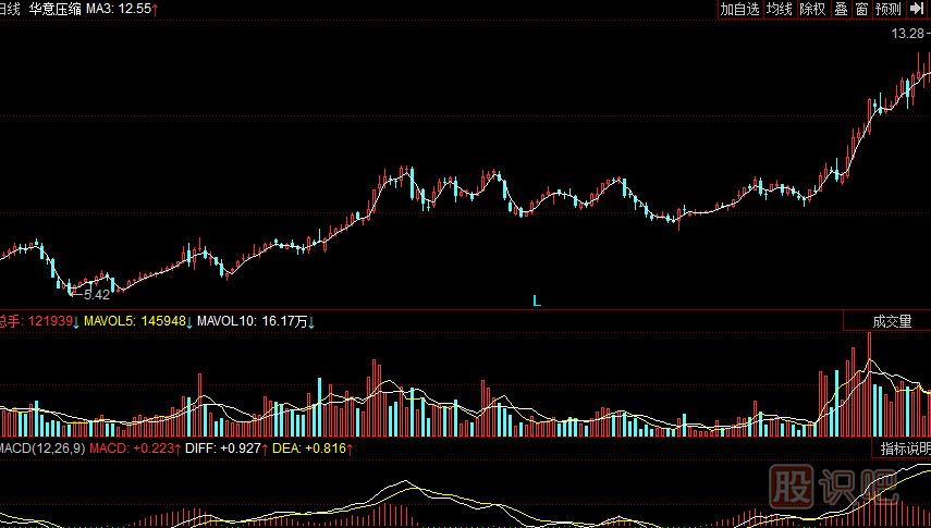 案例:如圖所示,華意壓縮(000404)在2009年9月初連續(xù)收出13根小陽線,3日均線將這些陽線串成了鏈子,這是主力吸貨的信號。隨后該股股價略作回調(diào),于10月初繼續(xù)收出一串陽線。這是很明顯的吸貨征兆,投資者可在此介入,之后該股中線走強(qiáng),股價漲了近三倍。