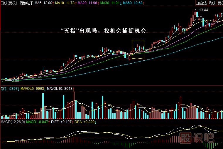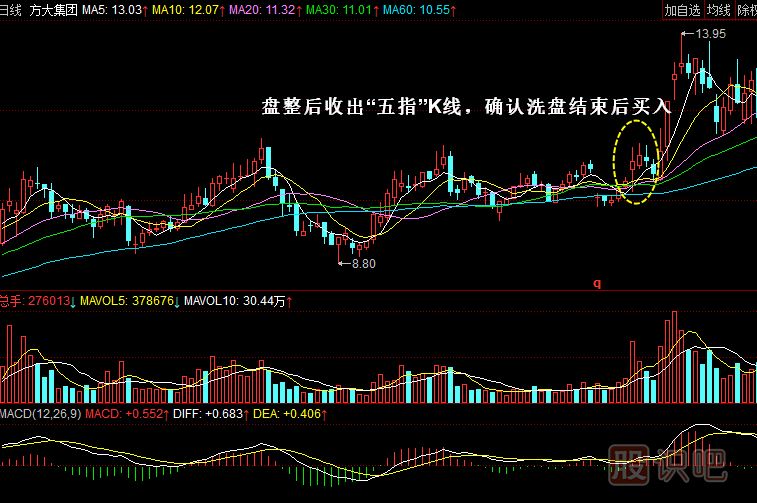 經過這樣一個短周期的運行,主力完成了啟動、拔高、回檔三個步驟,接下來就是開始新一輪的拉升行情,因此在五指K線出現(xiàn)之后,我們可以在“小指”處試探性買入,一旦股價再次放量走強,可以繼續(xù)加倉。