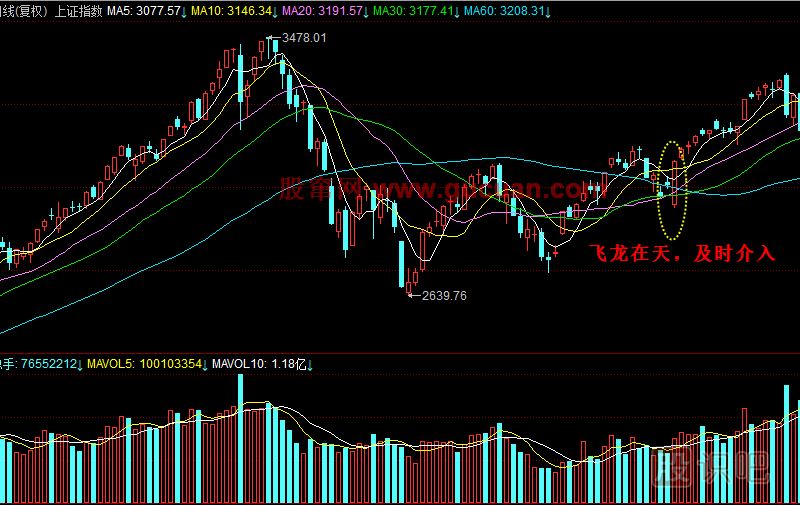 3.飛龍在天可在大陽線當天臨近收盤時介入,穩(wěn)健的可在第二天回踩時介入。