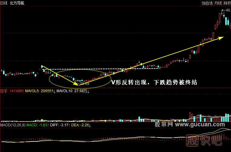 1.V形反轉(zhuǎn)是一種底部反轉(zhuǎn)信號,由連續(xù)下跌轉(zhuǎn)為連續(xù)上升。
