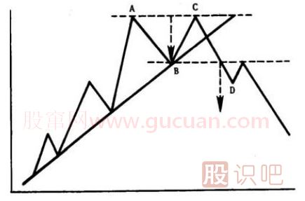 如圖,雙頂?shù)睦?,這個(gè)形態(tài)有兩個(gè)大致處于相同價(jià)位的波峰(A和C)。當(dāng)市場按收盤價(jià)衡量跌破了點(diǎn)B處的波谷時(shí)形態(tài)就完成了。通常,成交量在第二個(gè)波峰(C萎縮),并在向下突破(D)時(shí)放大。反抽下面一根直線的現(xiàn)象并不少見。最小測量目標(biāo)是從突破點(diǎn)向下投射出形態(tài)的高度。
