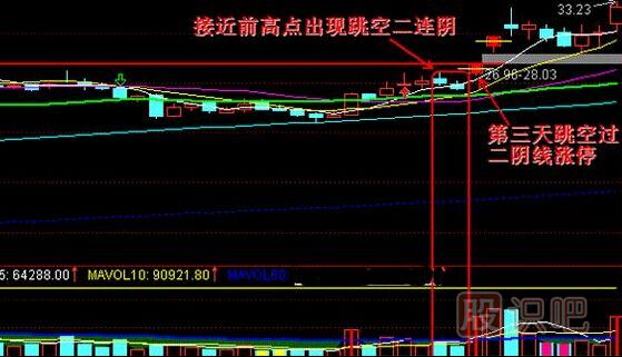 兩陰線之間一定要有跳空缺口;兩陰線都應(yīng)該有較長的上下影線,特別是第二根陰線一定要有下影線。