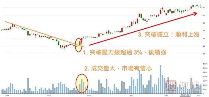 若能有效突破 下降壓力線,加上大成交量,