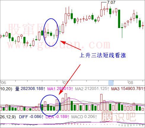 上升三法組合更多地出現(xiàn)在行情上漲的過(guò)程中。拉出大陽(yáng)線(xiàn)之后,雖然連續(xù)出現(xiàn)了三根小陰線(xiàn),但這可能是股價(jià)啟動(dòng)前的下蹲動(dòng)作,短暫蓄勢(shì)之后,股價(jià)將再度拉升。