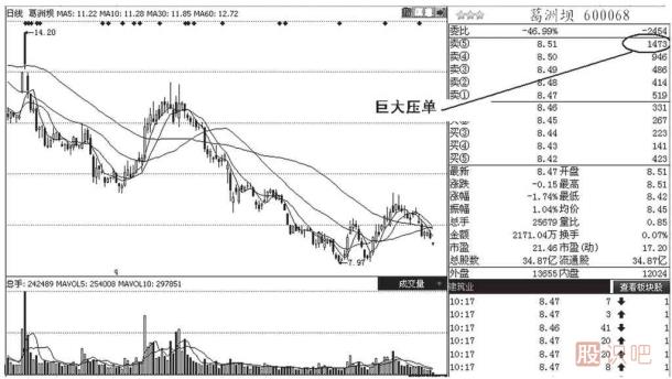 圖3-5為葛洲壩(600068)在2011年11月24日的盤面情況。我們看到圖中箭頭所指之處,掛出了一個1473手的大單,給人帶來強大的壓力,持股人擔心股價仍然會下跌,可能會就此賣出,而持幣者則可能就此看空,持觀望態(tài)度。